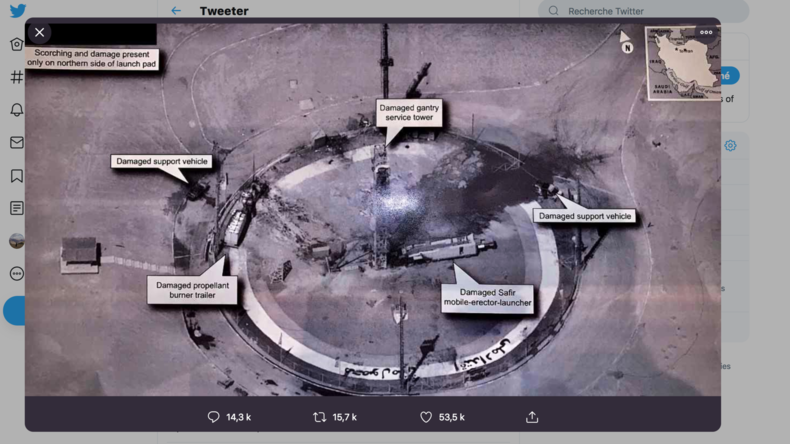 © Capture d'écran du compte Twitter de Donald Trump.Un tweet de Donald Trump assurant que les Etats-Unis ne sont «pas impliqués» dans l'explosion apparente d'une fusée en Iran accompagné d'un cliché extrêmement précis pris par les services de renseignement américain a attiré l'attention des experts.