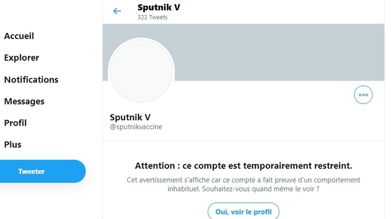 La page Spoutnik V, consacrée au vaccin russe contre le Covid-19 a été «temporairement» restreinte par Twitter durant quelques heures. La firme a restauré les accès par la suite, évoquant une connexion suspicieuse.